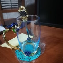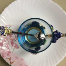 The girl of 20 years was delighted with the mug. I, a person of 40 years, treated calmly)) Gypsy gilding. But made relatively high quality. Everything is glued and painted. Even a butterfly from the inside. On the cup holder you can see traces of the molding (?). Spoon flat. Metal, but light. A small turquoise napkin is silicone. Very, very long shipping. Despite being paid. The store on the contact goes)) good, and he also suggested that local delivery slows down.